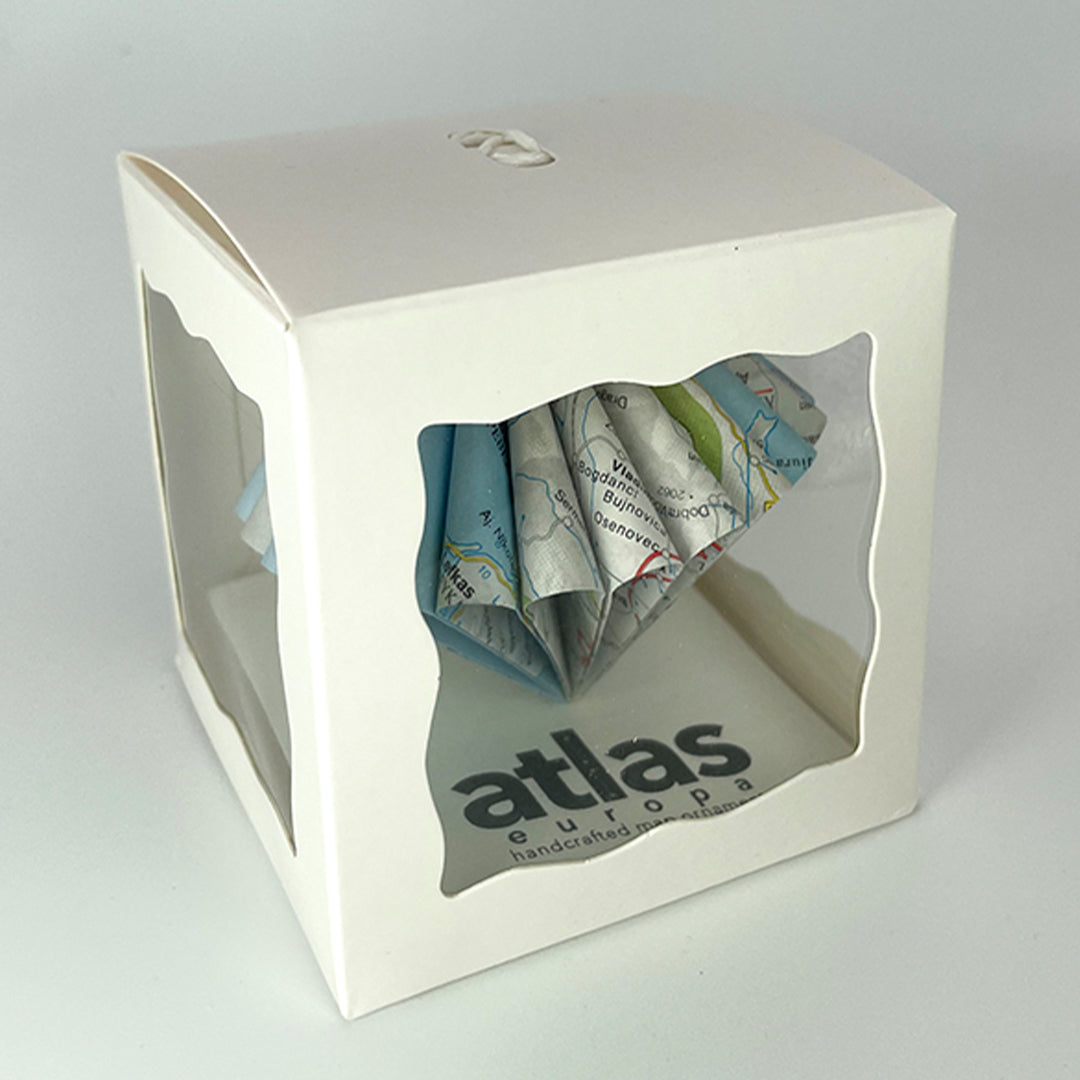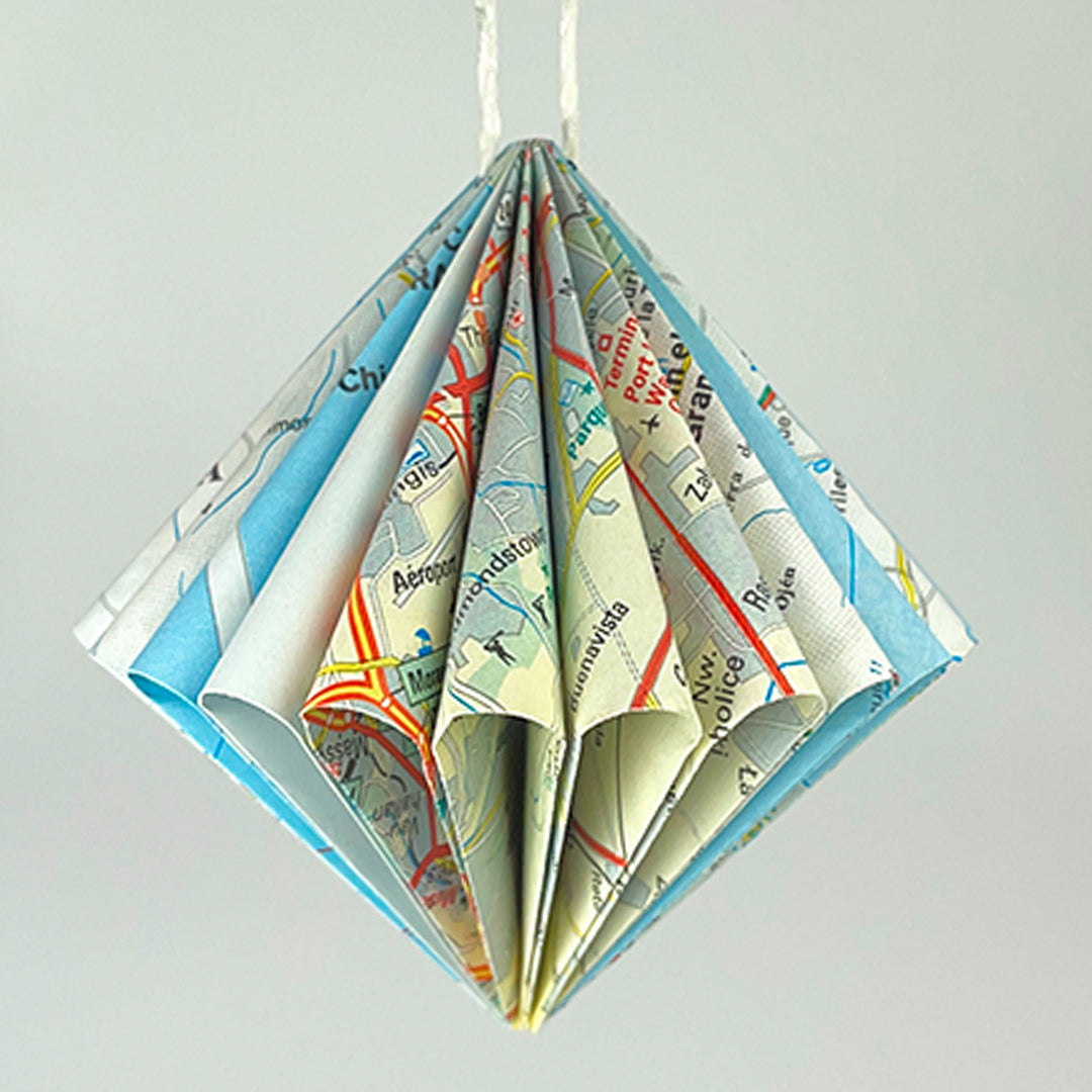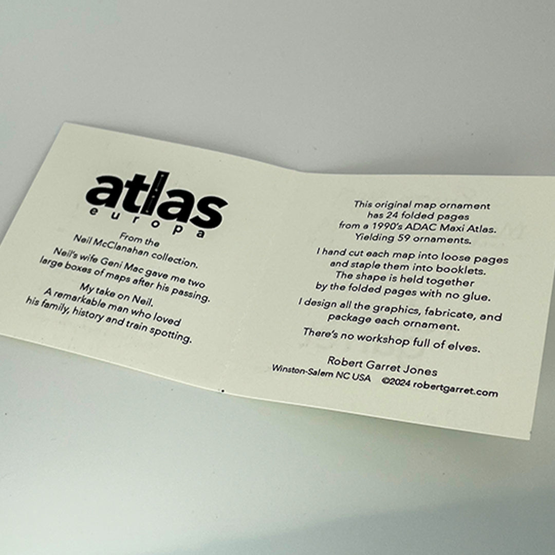 These paper ornaments are made from a 1990 ADAC Maxi Atlas of Europe. Featuring 24 folded pages from Neil McClanahan’s map collection, each hand-cut piece is one of 59 unique ornaments that bring vintage maps to life in a charming and creative way.
