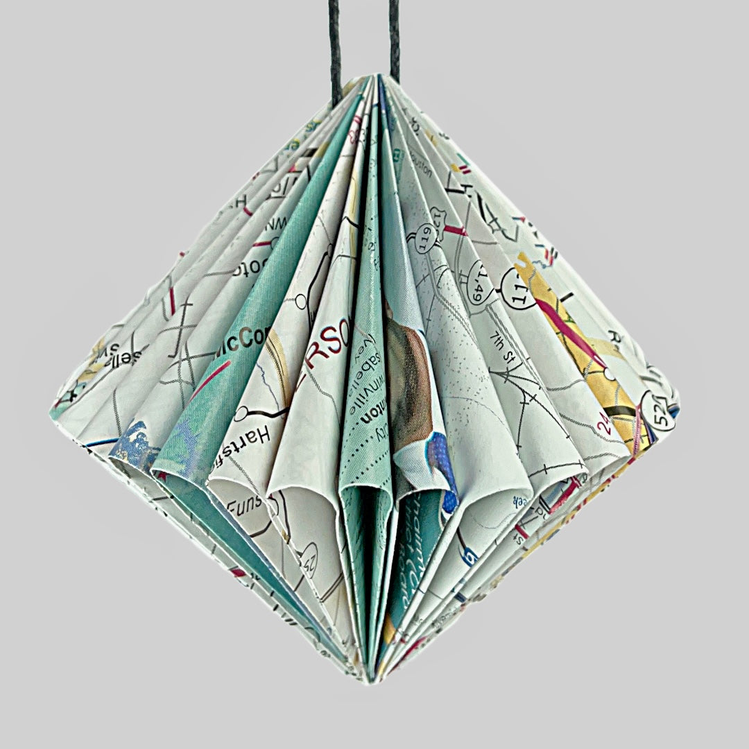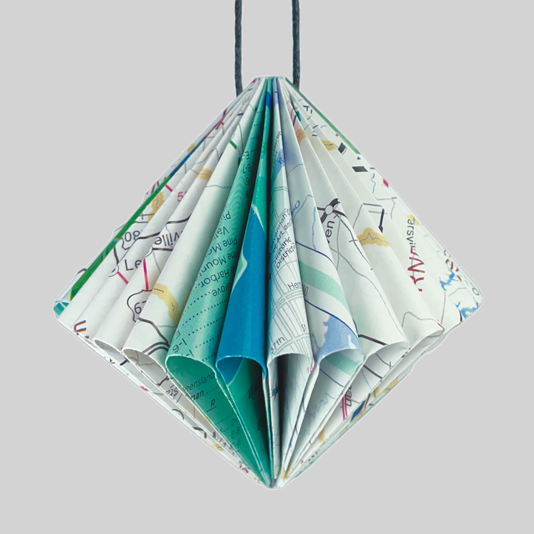 Each travel map is carefully cut into three sections. A single travel map will yield 3 ornaments with minimal waste.