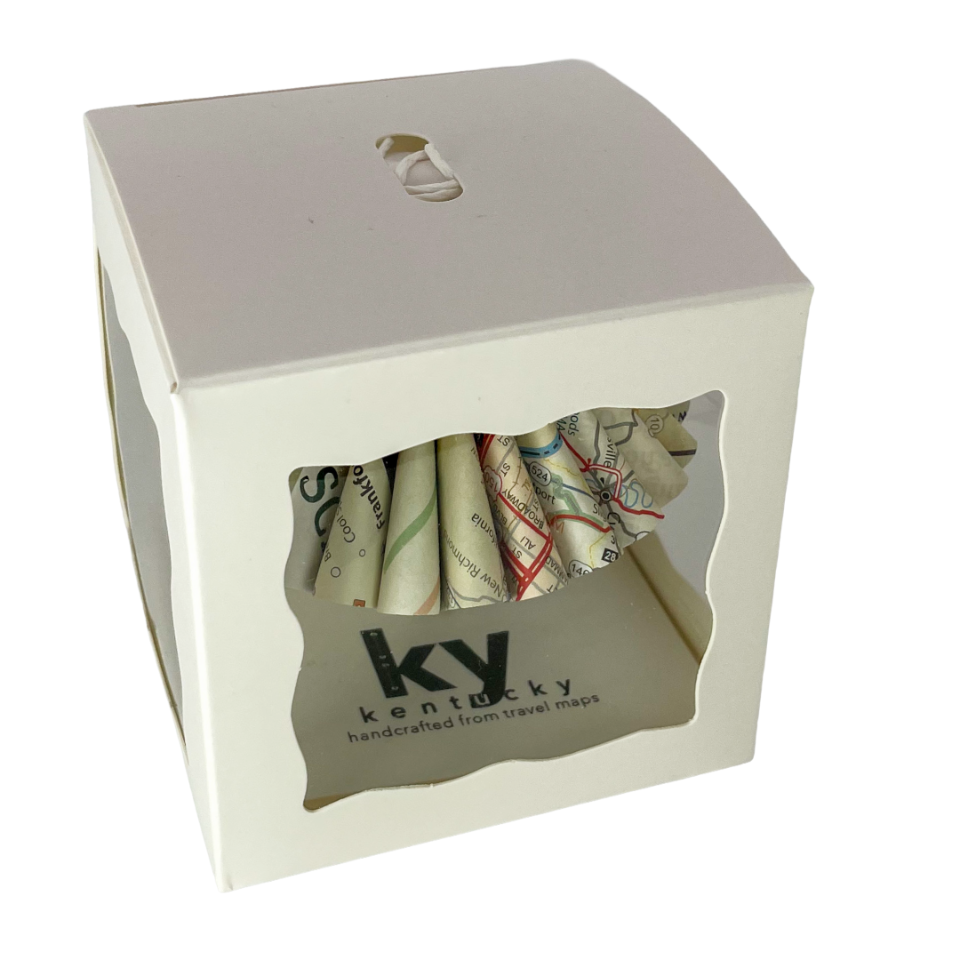 This unique ornament is made from upcycled Kentucky travel maps and hand cut to showcase the beautiful road map design. No glue is used, so it will hold together for years to come. Perfect for any traveler or as a memento from a trip to Kentucky.